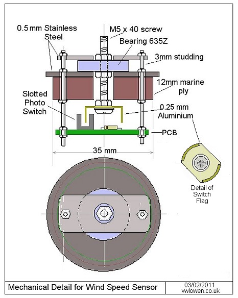 Mechanical PartsThe windspeed and wind direction sensors are a combination of mechanical and electronic parts. The "core" of the mechanical construction is identical for both sensors. These drawings detail the mechanical construction of the windspeed sensor.