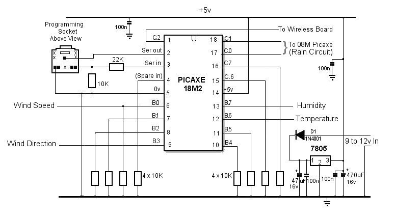 The Outdoor Unit - Circuit Diagram This circuit and the circuit for the 08M Picaxe for the rain sensor are built on the same PCB. The unit is supplied from a 12v 7AH lead acid battery which, currently, is being trickle-charged from the mains. Ultimately, I intend to add a Solar Panel to keep the battery charged. The 7805 voltage regulator supplies both Picaxes, all the remote sensors and the wireless module with 5 volts. I used an RF Connect kit from techsupplies.co.uk for the wireless link with a 433MHz transmitter/receiver pair from Bitsbox.co.uk. The Connect Kit contains a pair of specially programmed PIC chips which employ Manchester encoding/decoding and CRC checks on the serial data stream to make the wireless link as reliable as possible. There's quite a lot of 70cms (433MHz) radio activity near my location so it seemed sensible to try to make the wireless link as immune as possible from external interference. As the RF Connect kit and the wireless modules had proven themselves to be reliable during testing, there seemed little point in disturbing them so the complete RF Connect board is mounted on a corner of our Outdoor Unit board.