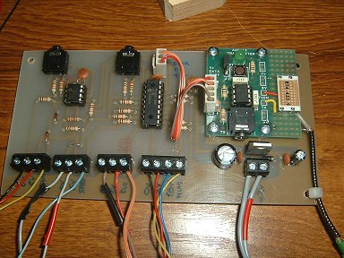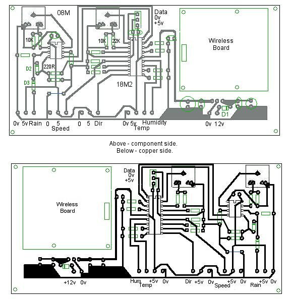 The Outdoor Unit - The PCB LayoutThe Outdoor Unit's PCB holds the rain gauge's 08M Picaxe together with the main 18M2. Each has its own programming socket and associated resistors. The 5 volts regulated power supply and the Wireless Module are together at one end. Separate connectors, each with their own +5v and 0v, are provided for each sensor - except for the temperature/humidity connections which share their +5v and 0v).