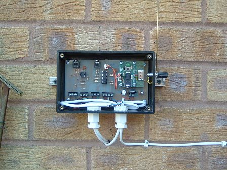 ![]() Outdoor unit attached to the garage wall. Hopefully, I won't need access to the Picaxe programming sockets too often. It would have been a shame to spoil the IP65 integrity of the box by drilling "access holes" in the top of the box.. If the Picaxes should need reprogramming, it will only be a case of loosening the PCB mounting screws and tilting the board forward an inch - or even removing the Picaxe and taking it indoors!