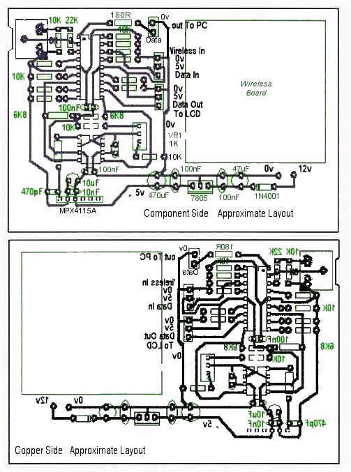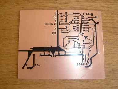 The Indoor Unit - The PCB Layout![]() As with the PCB for the outdoor unit, I drew the layout by hand using Paintshop Pro so don't rely on the pin spacing being exact if you use a photographic or printing method to produce the PCB. I use rub-on etch-resist transfers which allows me to 'tweak' the layout and pin spacing on the actual PCB as I go along. An example of where I changed the layout can be seen at the bottom left hand corner of the copper side of the PCB where I re-routed the tracks to accomodate a PCB-mounted 12 volt power socket. The board is slightly larger than is strictly necessary so as to fit in the grooves inside the aluminium case and to occupy the full width of the case to prevent it sliding sideways.