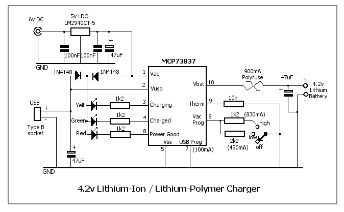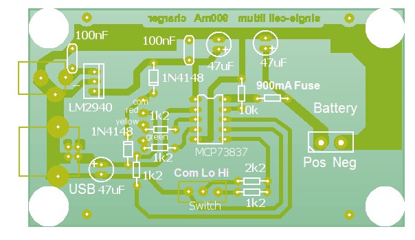 The Circuit![]() The circuit is taken straight from the MCP73837 datasheet except for the addition of the 900mA resettable fuse and the switched programming resistors connected to Vac prog. Note that the IC pin designations Vac (Pin 1 on the IC) and Vac prog (Pin 6 on the IC) are from the datasheet. References to 'ac' are a bit confusing. They refer to the use of an AC-DC 'Wallmart' type adapter for the power supply - the power to Pin 1 must be DC. I used a 5v LDO regulator to provide 5 volts DC to the IC. 6v DC is the maximum input to the LDO due to the limited size of the heatsink on the LDO. Because I've used an MSOP breakout board for the MCP73837, it's not possible to use the main printed circuit board copper ground plane as a heatsink. Although I've cobbled together a heatsink, of sorts, I decided to restrict the HIGH charge current to around 830mA. The LOW setting provides 450mA charge current. The charge current is set using switch-selectable resistors connected betweem Vac prog and ground. When using the USB power source, the charge current is limited to 100mA regardless of the switch setting. In practice, the USB ports on my computer only provide around 90mA maximum. If both DC power (Vac) and USB power (Vusb) are connected at the same time, the MCP73837 automatically uses Vac as the power source and the maximum charge current is determined by the setting of the HIGH/LOW switch. Regardless of which power source is in use, making Vac prog open circuit (HIGH/LOW setting to OFF) will terminate the charge and put the charger into standby. Three LEDs indicate 'Power Good', 'Charging' and 'Charged'. If you use different coloured LEDs, you may need to tweak the values of the LED series resistors if you're fussy about having the LEDs equal brightness. I'm regarding this version of the charger as a 'Mark 1'. The case I chose was a bit too shallow to allow for a decent heatsink on the 5 volt LDO regulator. As a result, the input voltage has to be kept to 6v (I was hoping for 6 - 9v) and, even at 6v, the LDO gets quite hot during the initial charge. A 1.5A regulator would probably help. A larger case may allow for some additional functionality as well.