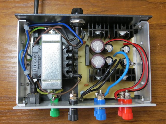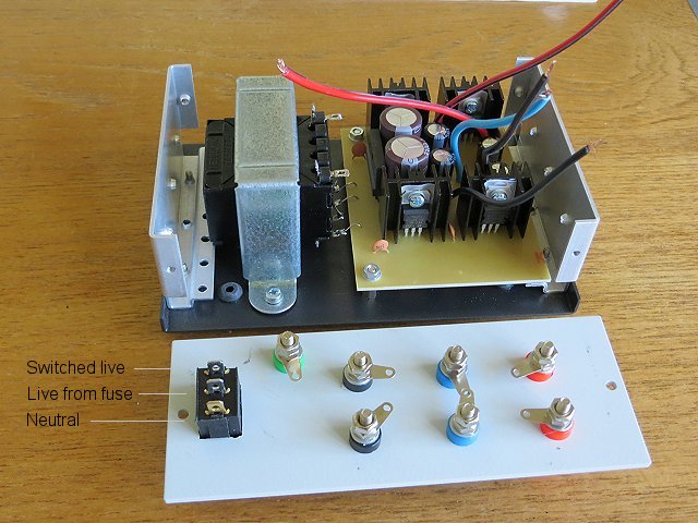 Use a good quality screw-in type panel fuse and ensure that the design is such that, when removing the fuse holder, it is well clear of live internal contacts before there is sufficient clearance to be able to touch the fuse (or the holder's metal parts) with your fingers. The mains earth (ground) lead is connected to the enclosure through the transformer mounting bolt. Note that any parts of the enclosure that are attached separately (such as the front & rear panels and the top attached with self-tapping screws, for example) should have their own earth wire back to the same transformer mounting bolt. Do not rely on the self-tapping screws for earth continuity. Try to leave the incoming earth conductor longer than the live and neutral conductors so that, if the cable does get forcibly pulled, the earth will be the last conductor to break. All exposed mains-voltage connections - to the illuminated switch, the fuseholder and the transformer - must be insulated with heat-shrink sleeving and/or access prevented with insulating covers. It should not be possible to make contact with any high voltage connections - even with the top cover removed - without a determined and conscious effort! The mains cable entering through the rear panel must be protected from chafing with a rubber grommet and the cable must be clamped against moving inside the enclosure to prevent the connections being pulled or twisted and to prevent the grommet being pulled from its hole. Despite what commercial products may do, do not use the printed circuit board for any mains voltage part of the circuit.