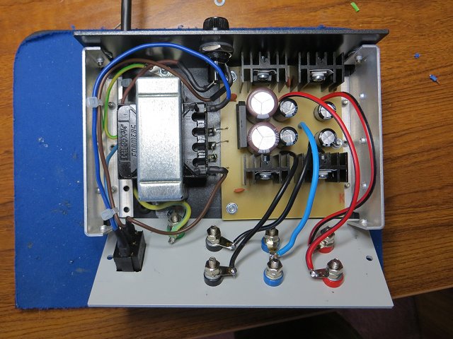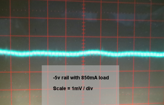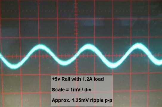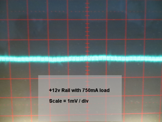 TestingRipple and noise figures are notoriously difficult to measure (See EEVblog's video) but ripple on all the outputs is less than 2mV p-p when feeding a 1.0A load - ie twice the designed load.My old analogue oscilloscope is better than the Digital Storage Oscilloscope for this job: It has 1mV/div vertical scale (5mV/div x 5 magnification) whereas the best the DSO can manage is 20mV/div. There's a small amount of high frequency common mode noise on the signal, which is present even when the power supply is switched off, so it's probably coming from the PCs or monitors. Ripple performance of the positive and negative outputs is very similar so, for example, on both 12 volt outputs, the ripple is negligible at 750mA but rises to about 0.5mV p-p with a 1 amp load. Similarly, the ripple on both 5 volt outputs is negligible at 850mA load but rises to about 1.25mV p-p with a 1.2A load.