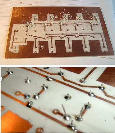 Incidentally, leaving large areas of copper as shown in these photographs, is good practice for parts of the circuit which are connected to 0v (or Ground). As a bonus, it helps preserve the etching solution. Use plastic electrical tape to mask large areas from etching - ensuring it is pressed down really firmly.