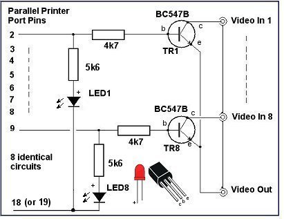 For small quantities of resistors, Bitsbox.co.uk seem good value although I haven't used them personally. I got the phono sockets and pcb from Maplin. The circuit consists of 8 identical transistor switches operating as emitter followers. Each composite video input is connected to an NPN transistor's collector, all the emitters being connected together to provide a common video output. When +5v is applied to a transistor's base from the parallel port (via a 4k7 resistor), the transistor switches on allowing the video to pass from collector to emitter. Almost any small signal NPN switching transistor should be suitable. The BC107B, for example is virtually identical to the BC547B except for its case style and lower maximum operating frequency. An indicator LED is also connected to each parallel port output through a 5k6 0.25W resistor. In order to keep the load on the port's outputs as low as possible, try to keep the LEDs' series resistors as high a value as possible. The LEDs don't need to to be excessively bright. For the same reason, don't be tempted to buy LEDs with built-in resistors. They're designed to operate the LED at its maximum brightness and current, which we don't need.