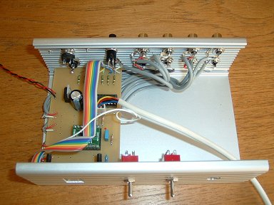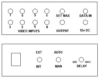 The 8 holes at the bottom left (the back of the case) are for the 8 phono sockets for the video inputs. There are two sockets at the right hand end of the back. The top one is a miniature 4-pin socket for the three incoming data lines (plus ground) from the computer parallel port, Velleman USB board, etc. The bottom socket is for the 12v DC power in. Near the centre of the back panel, hidden from view by a push button switch, is a hole for the video out phono socket. The push button plays a part in the switching and timing circuit, to be discussed on the next page...