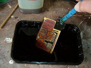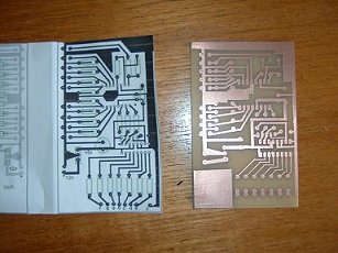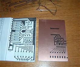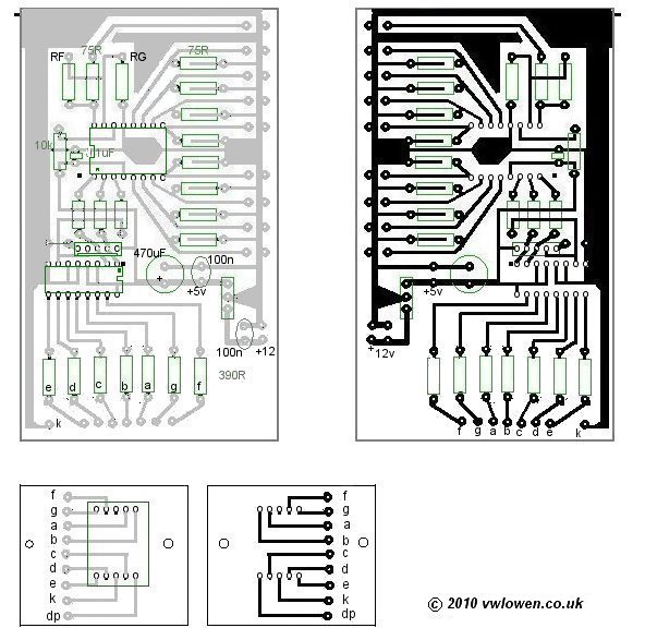 Click here for a larger layout view If you design your own, bear in mind that Maxim recommend extending the ground plane as much as possible except around pins 15 & 16 and the output gain-control resistors, RF and RG. The smaller PCB is for the 7-segment LED which is attached to the front panel of the case. I made the PCBs using rub down etch resist transfers. In the following images, you'll notice deviations from the layout design because changing the route of the tracks made life easier when I came to actually apply the transfers.