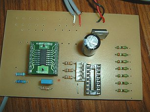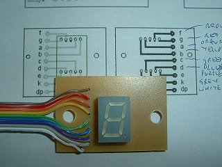 Points to noteWith this particualar PCB layout, please note:The two IC's orientation is NOT the same (the square dot denotes pin 1). Note the 5-pin header near the socket for the 4511B. The outer pins carry 0v and +5v. These pins will supply power to the switching and timing board. (0v is also the common ground for the data lines). Because of the layout of the PCB (and the pin-out of the two ICs), data pins D1 and D2 are reversed on this header. Therefore, counting from the outer edge of the board towards the large capacitor, the pins are 0v, D0, D2, D1, +5v.