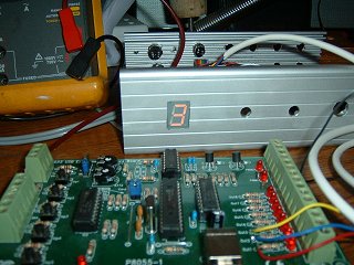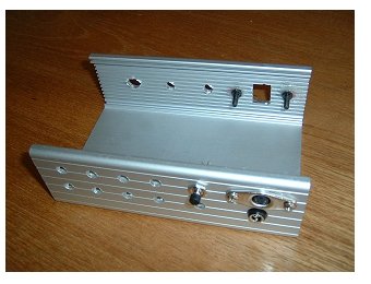 Top right of the photo shows the cut-out for the 7-segment display. I chain-drilled and filed to get the rectangular shape. Note the two bolts Araldited onto the case to provide 'studs' for the display board. A simpler solution would be to just drill a couple of holes through the case! Because the inside of the case has grooves to hold the PCBs, mounting the LED display behind the rectangular hole would have resulted in the untidy-looking edges of the hole being on show. Making the display a 'neat' fit in the hole and fitting it flush with the front, concealed the untidy edges.