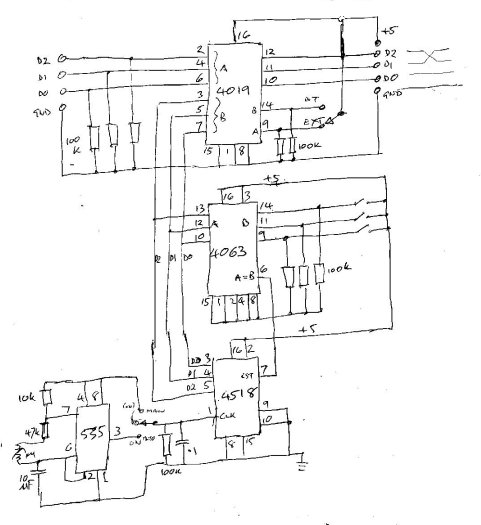 Module 2: The switching and timing circuitThis second part of the video switcher allows control of the three video selection data lines to be swapped from the external source (parallel port, Velleman USB board, etc) to internal control. This internal control needs to provide the following functions: