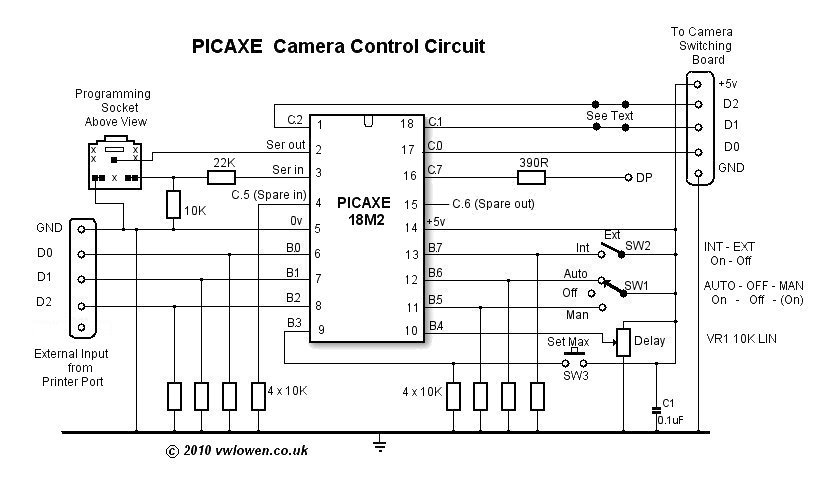 The PICAXE Circuit![]() Operation of the circuit is controlled by the software we download into the PICAXE chip through the programming socket (shown at top left in the diagram above). Once programmed, the software remains in the chip even if the supply is removed and later restored. The three data lines, D0, D1 and D2, on the left of the diagram are the three external lines from the computer's parallel port or the Velleman USB board. They are connected to three of the chip's pins which the chip automatically defaults to be inputs at power-up (B.0, B.1 and B.2). If switch SW2 is open (External), the three data lines are simply passed through the chip and appear on its output pins at C.0, C.1 and C.2. (Our software will configure these pins as outputs). From there, they simply connect via a couple of headers to the data input of the Video switching board. To all intents and purposes, this second circuit is effectively 'transparent.' When SW2 is closed (Internal), the data lines at B.0, B.1 and B.2 are ignored and control of the output pins (C.0, C.1 and C.2) passes to the software inside the PICAXE itself: