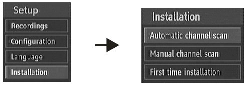 Step 2In the Setup menu, select 'installation' and press 'OK'.In the Installation menu, select 'Automatic channel scan' and press 'OK' A box will pop up. Select 'Yes' and press 'OK'