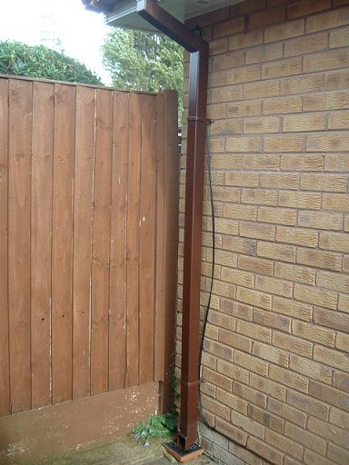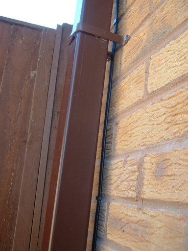 | Although putting cable behind pipe is acceptable, it should be pulled taught and tied. I took the downpipe off and clipped the cable behind it. (I wouldn't have expected the installer to do that!) |  |